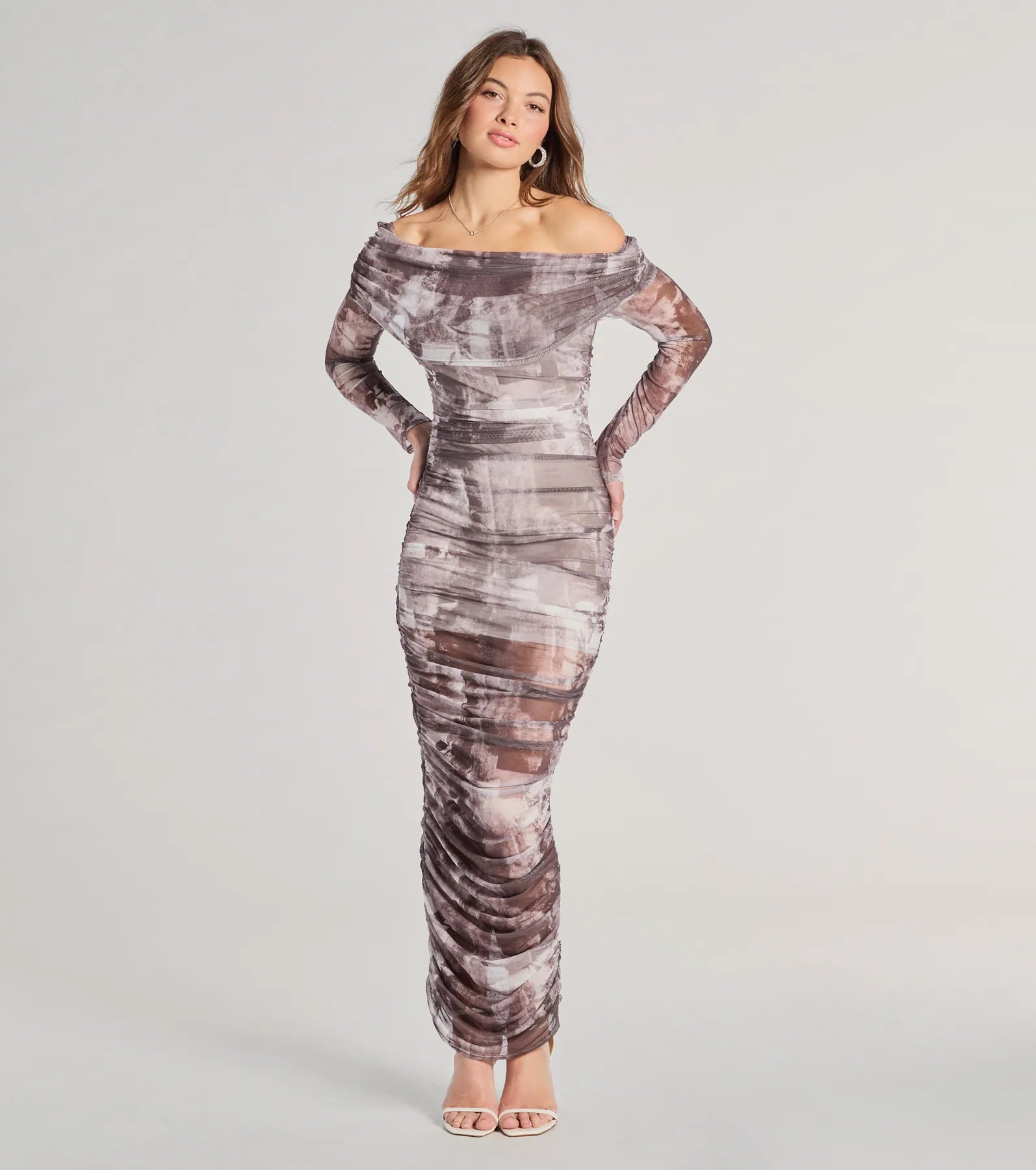 Dress to impress in this abstract print maxi dress flaunting a folded off-the-shoulder neckline. sheer fitted long sleeves. and a flattering ruched bodycon silhouette. Pair with heels.