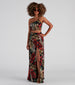 This tropical palm leaf printed maxi skirt is totally vacay approved! It features a high-rise waist. a chic thigh-high side slit. and a flowy. floor-length silhouette. Style with the matching crop top for sunset dinner by the beach.