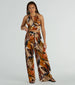 These alluring tropical wide-leg pants will have you ready for a dreamy vacay! The stretchy knit fabric features a bold abstract tropical print pattern to catch all the glances on your getaway. The pants are shaped with a high-rise elasticized waistband for comfortable wear and a relaxed wide-leg silhouette for a trendy look. Style with the matching crop top and hoop earrings.