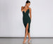Create a polished yet sexy look for yourself in our Vada! She features a wired deep v neckline. spaghetti straps that lead to a lace up back detail and a lower back zipper closure with a hook and eye to keep her in place. Bodice is designed with a gathered pleating at the bust. and leads down to a mid length hemline and a high slit at one side. She is fully lined and composed of a crepe material that offers moderate stretch and a form fitting silhouette.Â