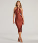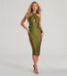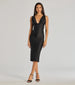 Versatility at its finest. the Valerie midi formal dress offers multiple styling options to suit your mood for any formal occasion! She boasts a convertible-style neckline with straps that can be worn as a halter. one shoulder. and more. a bodycon midi silhouette that flatters your curves. and a center back slit for movement. Complete the look in stiletto heels and teardrop earrings.