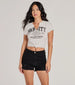 Flaunt your babe status on campus in this flirty graphic crop top! It features classic short sleeves. a V-neckline. a front graphic script that reads "Varsity College League". and a knotted crop hem that flaunts your waistline. Complete the look in denim shorts.