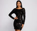 Dress to impress in our shimmering Kimmy dress that stuns for your next special evening. The dress features a wide round neckline. fitted long sleeves. and a sequin scroll pattern. The dress is composed of a lined mesh fabric that offers a form hugging fit with minimal stretch. Complete look with a rhinestone clutch and rhinestone rings.Â