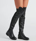 These over-the-knee boots were made for your daily stylish walks to and from the coffee shop! They feature a round toe. side zipper closure. PU front panel. a back knit panel. a flat sole. and low heel. Complete the look in a trendy crop jacket.