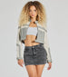 This faux leather moto jacket features long sleeves. a standing collar neckline. and a trendy striped design and cropped hem. Perfect for layering over a LBD.