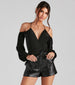 Make a sweet yet sultry first impression in this cold shoulder bodysuit featuring long sleeves with elastic cuffs. a v-neckline. sleek bungee straps that criss-cross along the back. and a surplice wrap bodice atop the thong-cut bottom with dual snap closures. Complete the look in fab leather shorts for a hot night out.