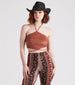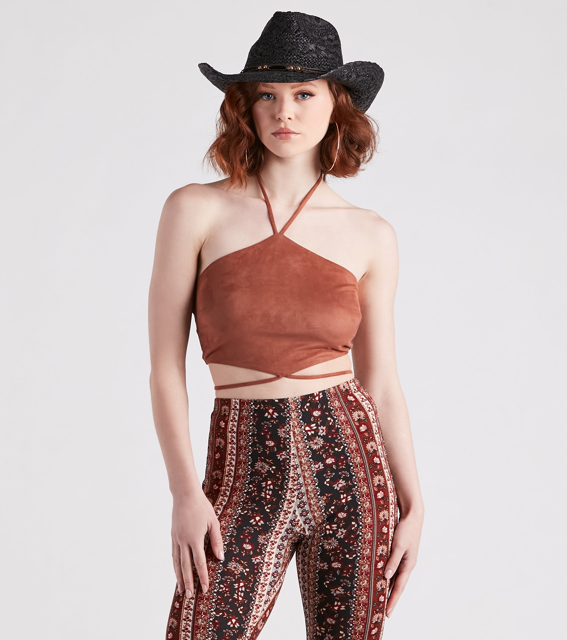 Show off a western flair in this trendy faux suede crop top! Featuring a sleeveless halter neckline with tie-back spaghetti straps. an open back. and a pointed. cropped hem with thin waist straps. this cute top is a summertime staple! Style with printed flare pants and strappy sandals.