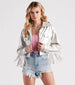 Give your look a wild and retro feel by layering on this faux leather trucker jacket perfect for festivals and country bars! It features long sleeves with button cuffs. a collar neckline. a button-down front. flap pockets. and a trendy fringe trim across the back. Complete the outfit with fun cowboy boots!