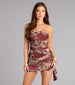Flirty. fierce. and a little untamed—this strapless mini mixes bold florals with wild animal print for a statement look. The ruched body and side sash detail sculpt your shape for that effortlessly sultry vibe.