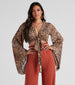 Shimmer and shine. unveil your wild side in this glitter striped leopard crop top for a night on the prowl. It features dramatic long bell sleeves. a plunge v-neckline. and a wrap-around design so you can customize the style. Complete the look in PVC mules.