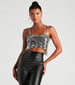 Show off your wild side in this alluring zebra print chainmail top! Featuring a sleeveless square neckline. thin tank shoulder straps with chain-link detailing. an open back design with a chain-link closure. and a fitted cropped hem. this top was made for a trendsetter like you. Style with faux leather pants and clear heels.