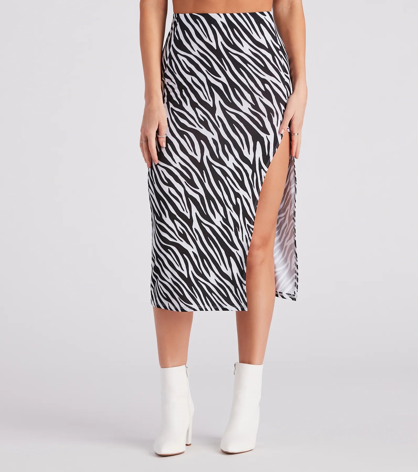 Show off a trendy wild style in this eye-catching zebra print midi skirt! It features a high-rise waist. a midi-length hem with a sultry thigh-high side slit. and a hip-hugging fit flowing out to an A-line silhouette. The skirt is composed of a knit fabric with a moderate stretch. Style with a basic bodysuit and ankle booties.