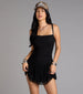 Equal parts fierce and flirty. this mesh mini dress brings major attitude with western-inspired belted straps and a ruffled hem that keeps it playful. The mesh scoop neckline and ruched sides seal the deal.