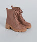 Enter winter mode with these casual and trendy platform combat boots! They feature an above-the-ankle height. a round toe. a front lace-up design. a platform and block heel with a lug sole. and are composed of smooth faux microsuede material. Style with a plaid fringe scarf.