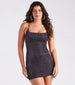 Bring the wow factor to the club in this glitter mini dress featuring a square neckline. bungee spaghetti straps that create the sultry strappy open-back design. and a bodycon silhouette that will flaunt your figure. The sparkling glitter knit fabric includes a full-length lining and offers a moderate stretch. Style this mini-length dress with chunky platform heels.