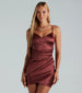 Wrap yourself up in this stylish satin mini dress for your next GNO! The dress features a sleeveless surplice V-neckline. spaghetti straps. a pleated side seam. a flattering bodycon silhouette. and a wrap hem. Complete the look in strappy block heels.