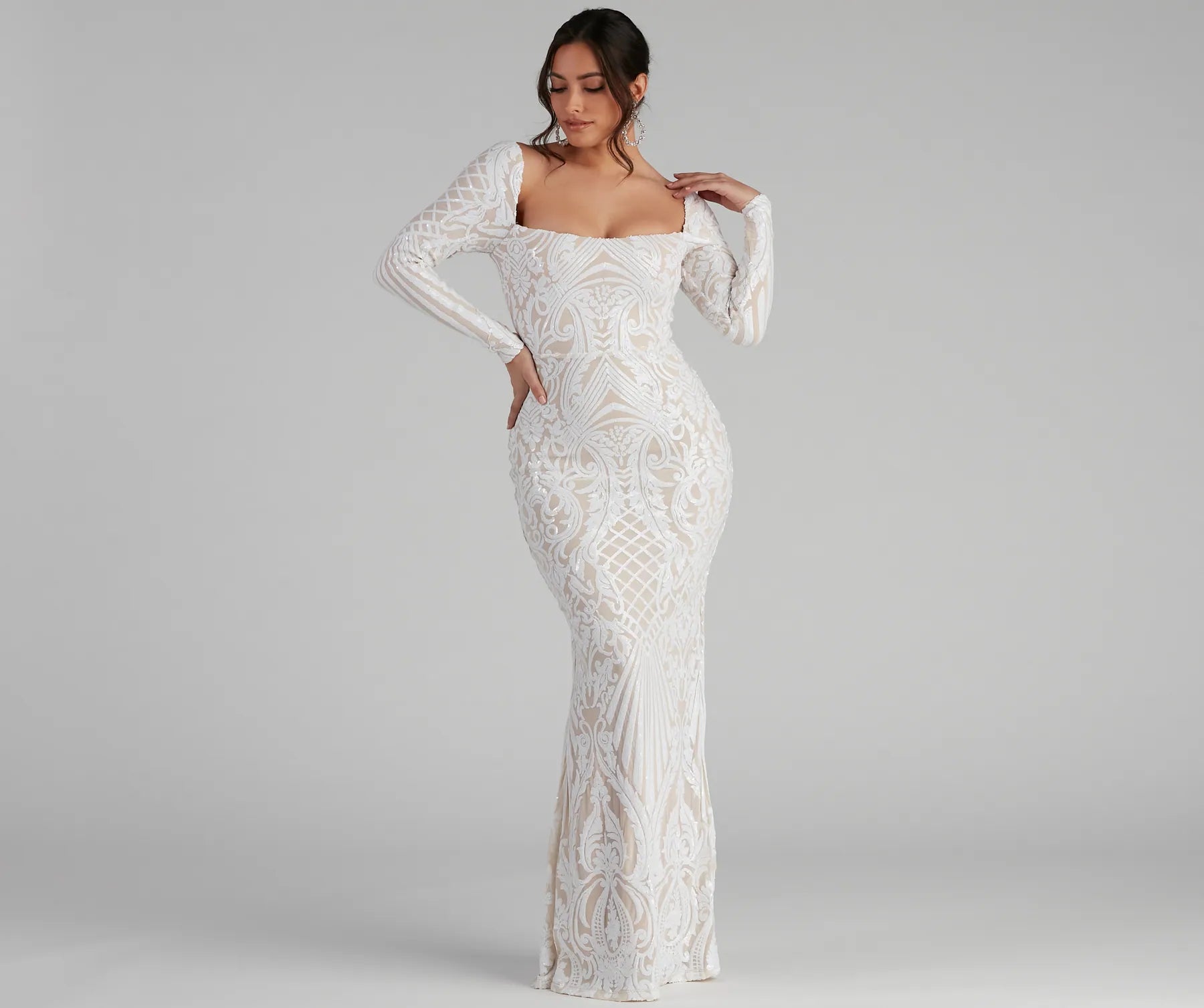 Make them all stop and stare with a stunning formal dress that exudes elegance. Yesenia features a bold square neckline. long fitted sleeves. a damask sequin pattern. and a curve-hugging mermaid silhouette. Complete your formal outfit with rhinestone earrings and glitter heels.