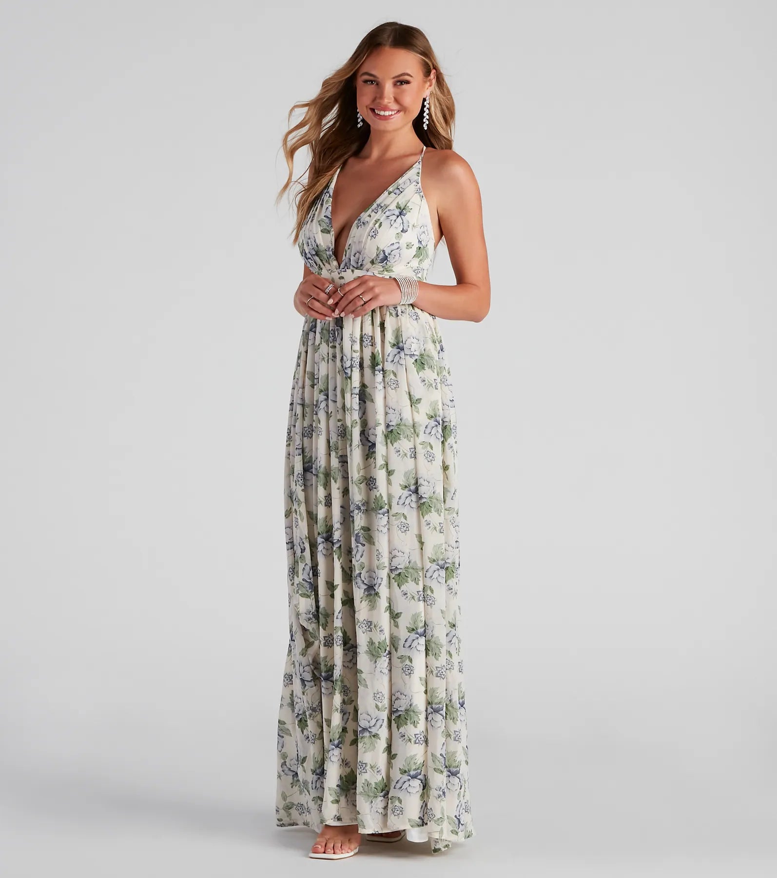 Let love bloom in a formal dress that brings the charm to your event! Zaya features a beautiful floral print. a sleeveless V-neckline. adjustable spaghetti straps that cross at the back. pleating throughout. and a high waist that leads to a flowy A-line silhouette. The dress is composed of a lined chiffon fabric that offers a relaxed fit with minimal stretch. Complete look with a rhinestone bracelet and heels.